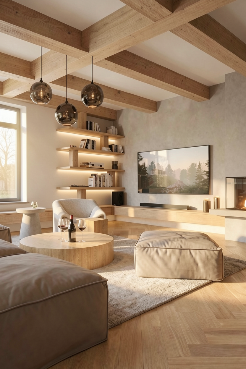Celý interiér je navržen v duchu přírodních materiálů a světlých tónů dřeva. Kombinace jemných barev, teplého osvětlení a přírodních struktur vytváří prostředí, které působí: